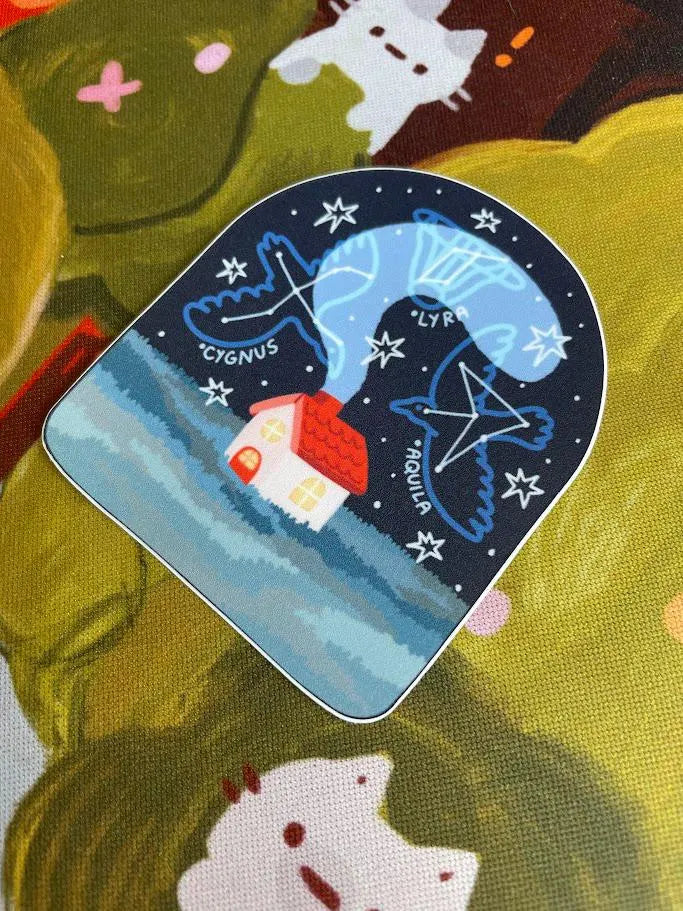 This sticker was made in collaboration with a local small business, Weird Sisters Yarn, located in Portland, OR. Through the inspiration of painting a window mural, I created a line of products that reflected the 2025 annual Yarn Crawl theme of Constellations, which included stickers, a bookmark, and a print. In 2025, Weird Sisters chose to focus on the Summer Triangle constellations! Feel free to check out my mural through my social media, as well as this amazing small business I've had the pleasure of working with!